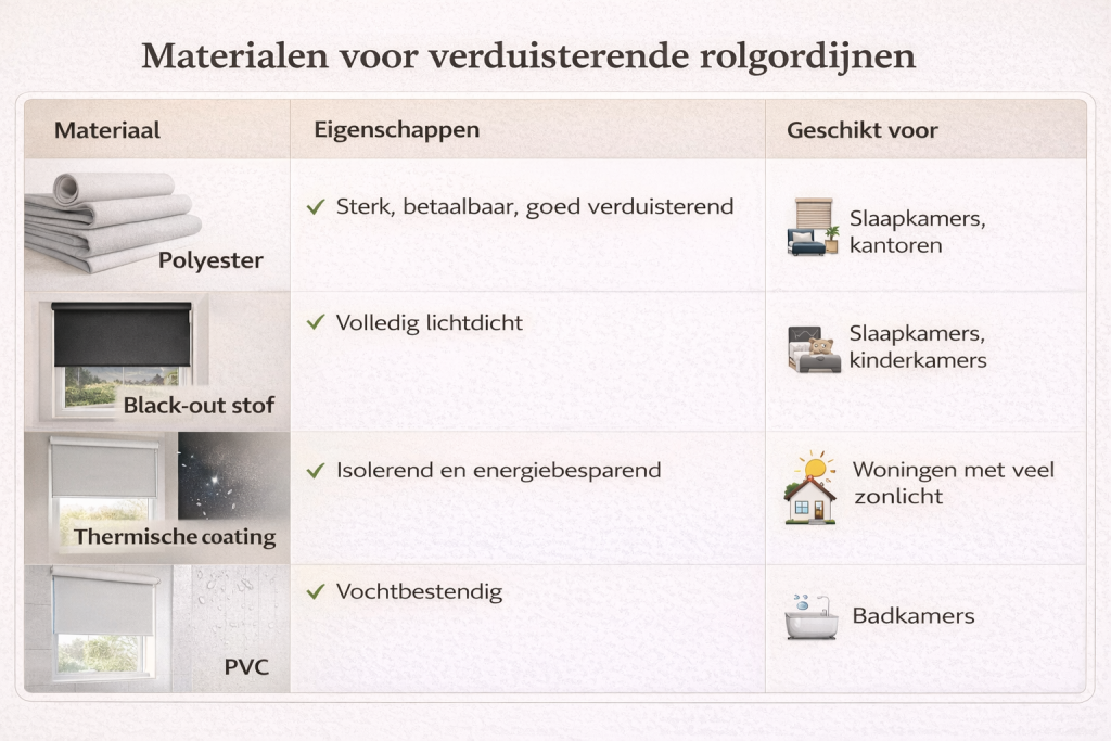 Het materiaal bepaalt niet alleen hoe goed het gordijn verduistert, maar ook de uitstraling en duurzaamheid.