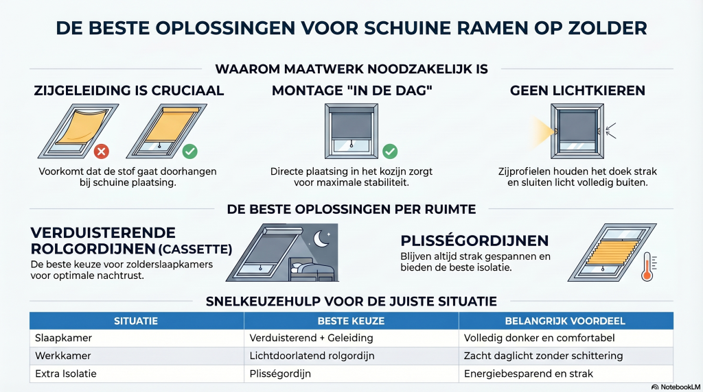 Voor een zolder met schuine ramen is maatwerk raamdecoratie essentieel. De juiste combinatie van systeem, stof en montage bepaalt het eindresultaat.